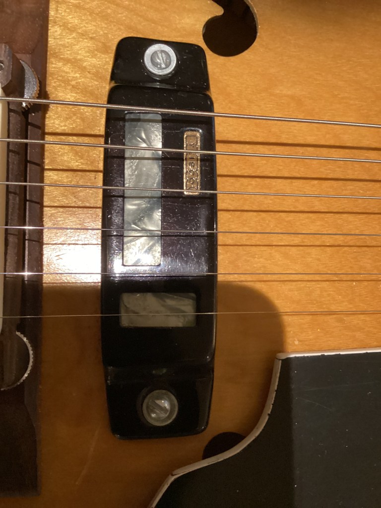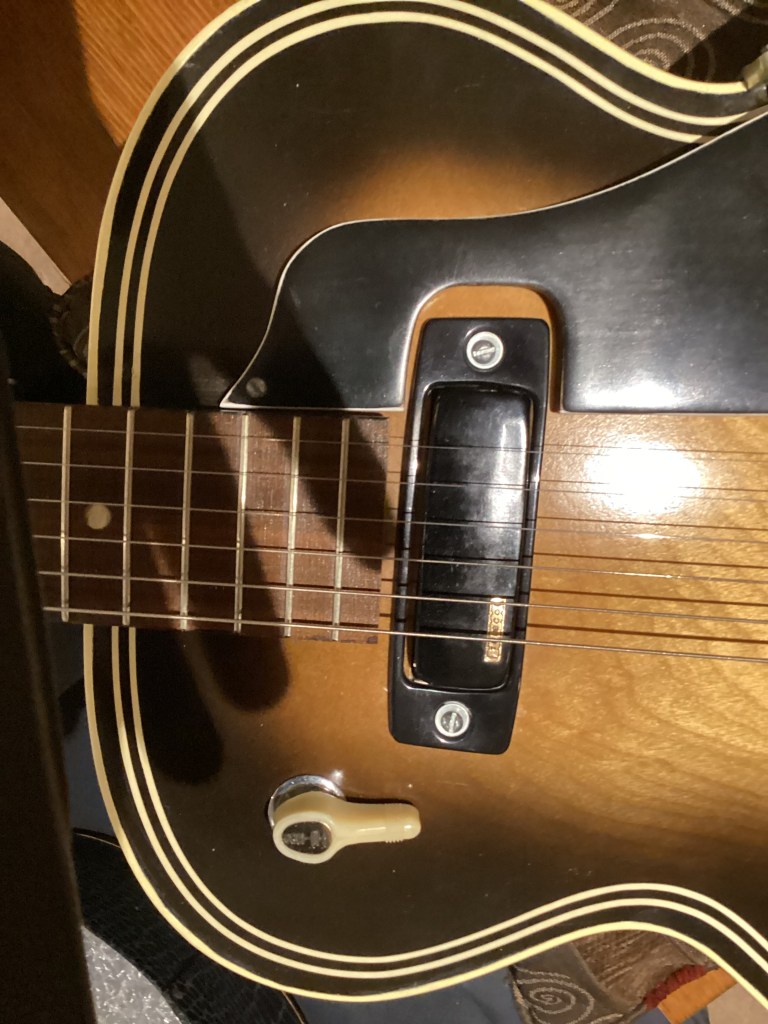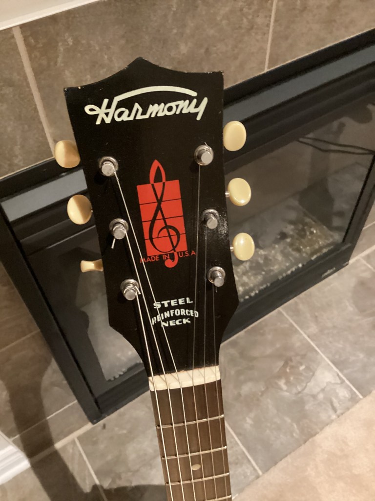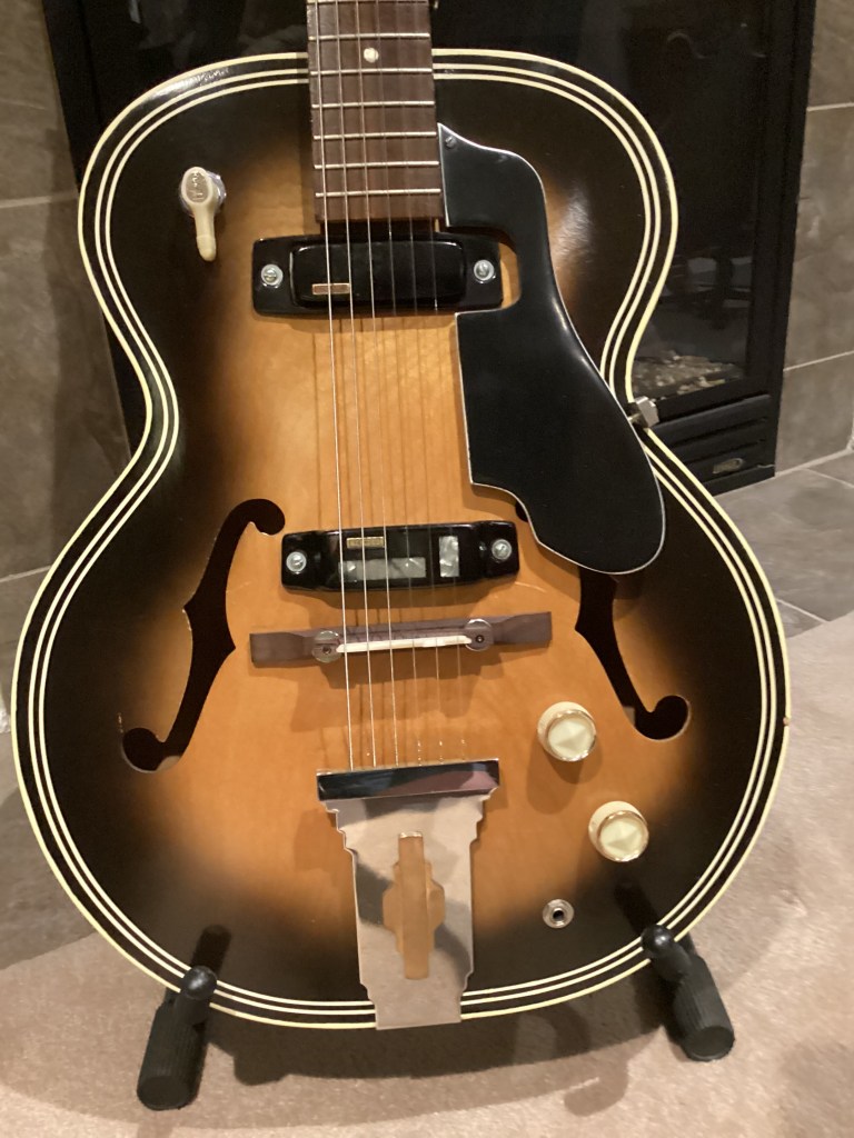I bought an early 60’s Teisco Jazz guitar about 40 years ago. I was going to repair it but I snapped the head off the neck trying to straighten it out… the wrong way! I decided to strip the guitar of all its hardware and electrical components before I threw it away (oops…second mistake) and stored everything in a box for future use. Fast forward about 25 years when I found a Harmony Archtop guitar on eBay. It came in its original alligator case and the guitar arrived with the back falling off and minus all hardware as advertised. I then went ahead with my first guitar build project. I removed the back which allowed me easy access to install the electrical components. All I had to do was cut two squares for the pickups and drill a few holes on the sound board for the volume controls and pups. The back was tricky to glue back on but I managed using an assortment of clamps and rubber bands. The faux purling on the back was a little tricky but I lucked out and found the perfect spray can with the exact colour. The guitar neck was in almost perfect condition and I managed to set everything up properly. The only parts not original were the bridge and tuning heads which I could not use. It plays very well and sounds like an old Jazz guitar from the late 50’s or early 60’s which is pretty cool. I really like how it looks and enjoy playing it.